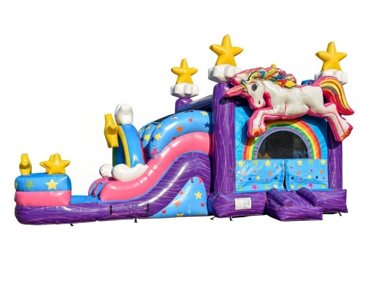The Unicorn Combo is a magical, eye-catching inflatable that brings enchantment and endless fun to any celebration! This whimsical bounce house features a stunning 3D unicorn leaping atop a vibrant rainbow arch, surrounded by sparkling stars, colorful clouds, and bold purple, pink, blue, and rainbow hues that sparkle with joy.